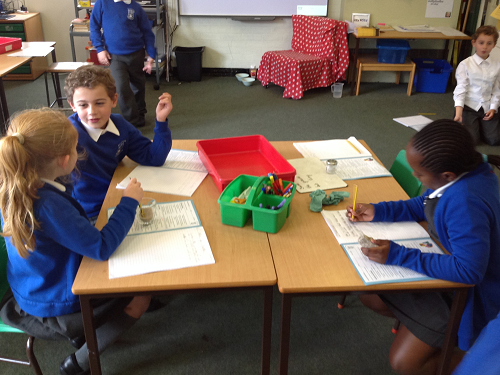 To expand upon the children’s good knowledge of different kinds of materials and the ways in which they can be used, today we thought about the different states of matter. We tried to pinpoint the differences between solids, liquids and gases. We described solids as materials which retain their shape on their own and liquids as those which flow and take the shape of their container. But a conundrum was sand: is it a liquid or a solid? It does after all flow and take the shape of whatever item it is poured into. The children were encouraged to reason which state of matter their four provided samples were, giving reasons for their choices.